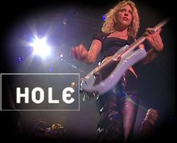 Saturday 23 January 1999, we are in the [V] backstage area at the Sydney Big Day Out with all four touring members of Hole. Melissa (Auf Der Maur) is clutching a cup of coffee, Courtney's got a cold drink, Eric (Erlandson) and Samantha (Maloney), drummer, sit on the end and get a word in when they can ... We start the interview as Courtney disses previous attempts by another TV channel to light her in a flattering way. Fortunately for us our lighting person makes her look real good ... |